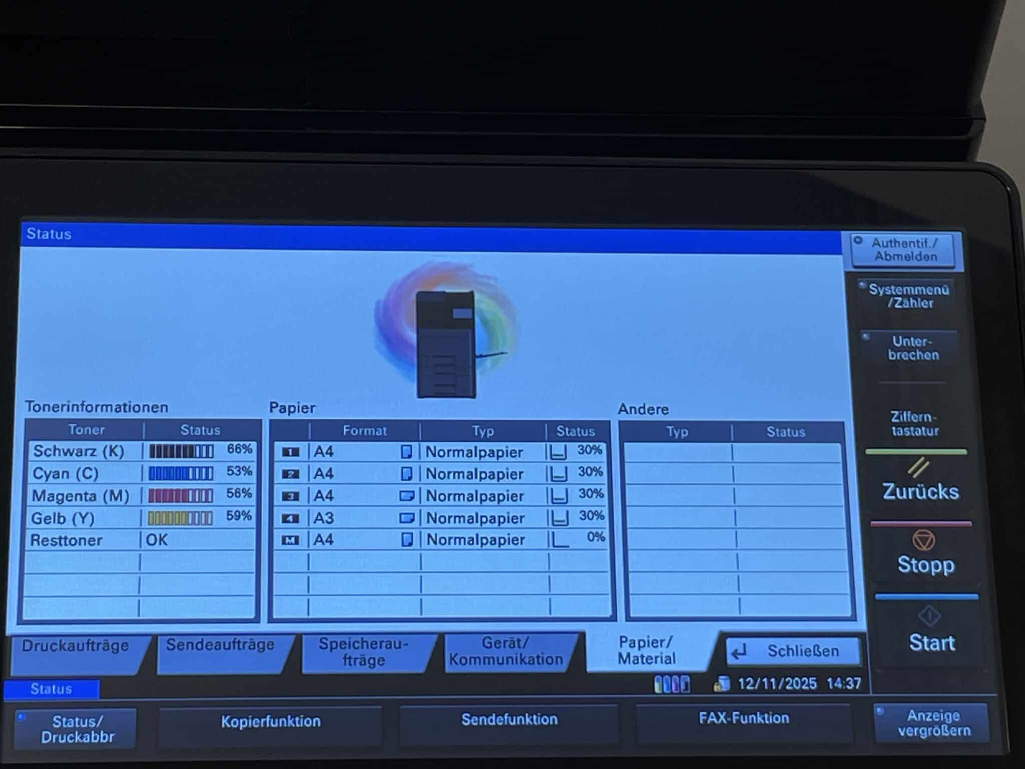 Tonerstand ca: Cyan 53%, Magenta 56%, Gelb 59%, Schwarz 66%
